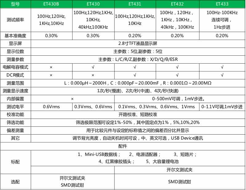 ET43系列手持电桥集2.8寸TFT显示、灵活方便的按键操作与USB全速通讯于一身;大容量锂电池可以保证长时间的工作。功能上不仅拥有全面的测量参数,还可以进行偏差测量和筛选,输出频率连续可调;在性能上,基本精度达到0.2%。